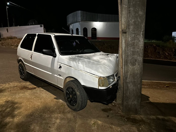 Um veículo Fiat Uno colidiu contra um poste na Rua Rio de Janeiro, no Setor 07 de Jaru, no início da noite deste sábado (27).