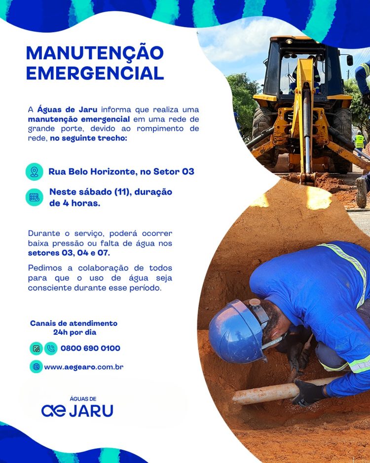 A empresa Águas de Jaru informou que realiza, neste sábado (11), uma manutenção emergencial em uma tubulação de grande porte localizada na Rua Belo Horizonte, no Setor 03.