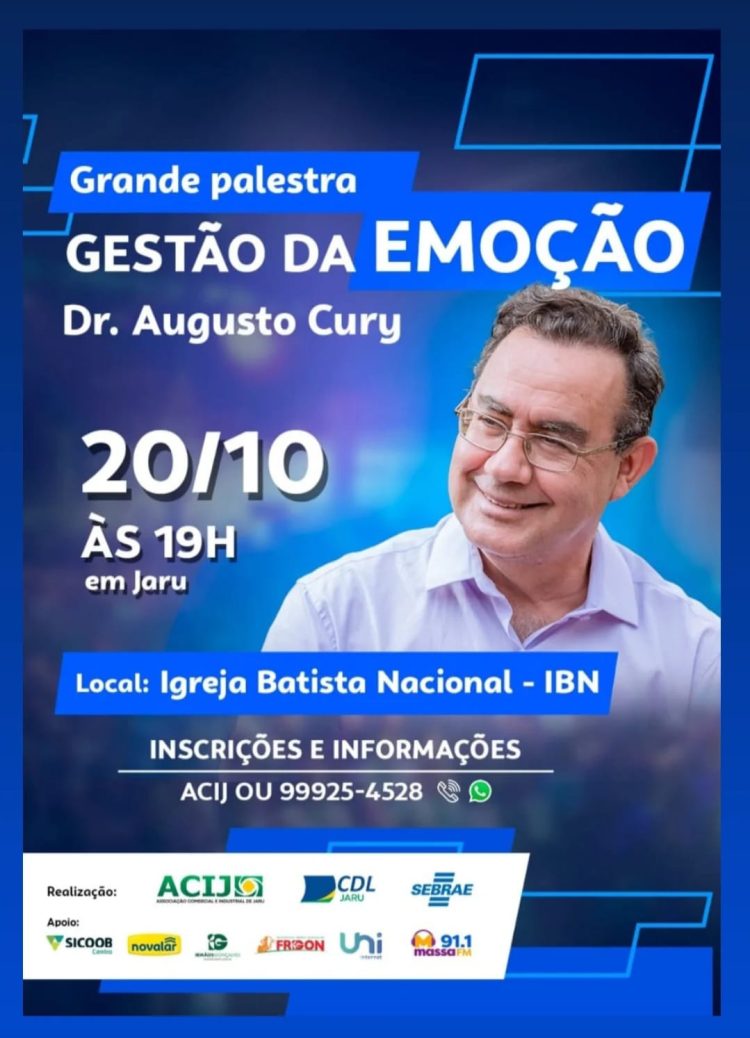 Na próxima segunda-feira, dia 20 de outubro, nossa cidade receberá o renomado palestrante e escritor Augusto Cury, com o tema “Gestão da Emoção”, em um grande evento que promete atrair centenas de pessoas de Jaru e de outras cidades da região.