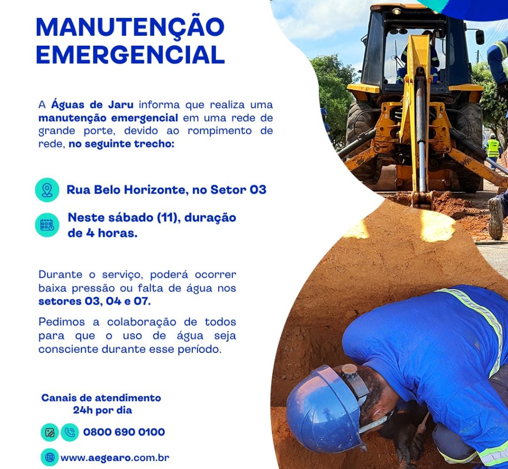 Serviço pode afetar o abastecimento nos setores 03, 04 e 07 A empresa Águas de Jaru informou que realiza, neste sábado (11), uma manutenção emergencial em uma tubulação de grande porte localizada na Rua Belo Horizonte, no Setor 03. De acordo com a concessionária, a previsão é de que os trabalhos sejam concluídos em até […]