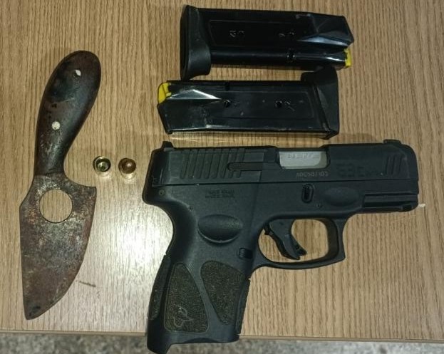 Ao chegarem à residência do suspeito, os policiais encontraram o carro na garagem e o homem em frente à casa, trajando apenas roupa íntima e apresentando sinais evidentes de embriaguez. No quintal, foi localizada uma pistola calibre 9mm, marca Taurus, modelo G3C, com uma munição na câmara e dois carregadores vazios no interior do veículo.
