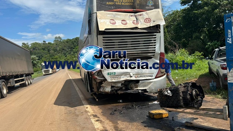 O impacto causou grande destruição nos dois veículos: a traseira do ônibus ficou parcialmente destruída e a frente da carreta completamente danificada.